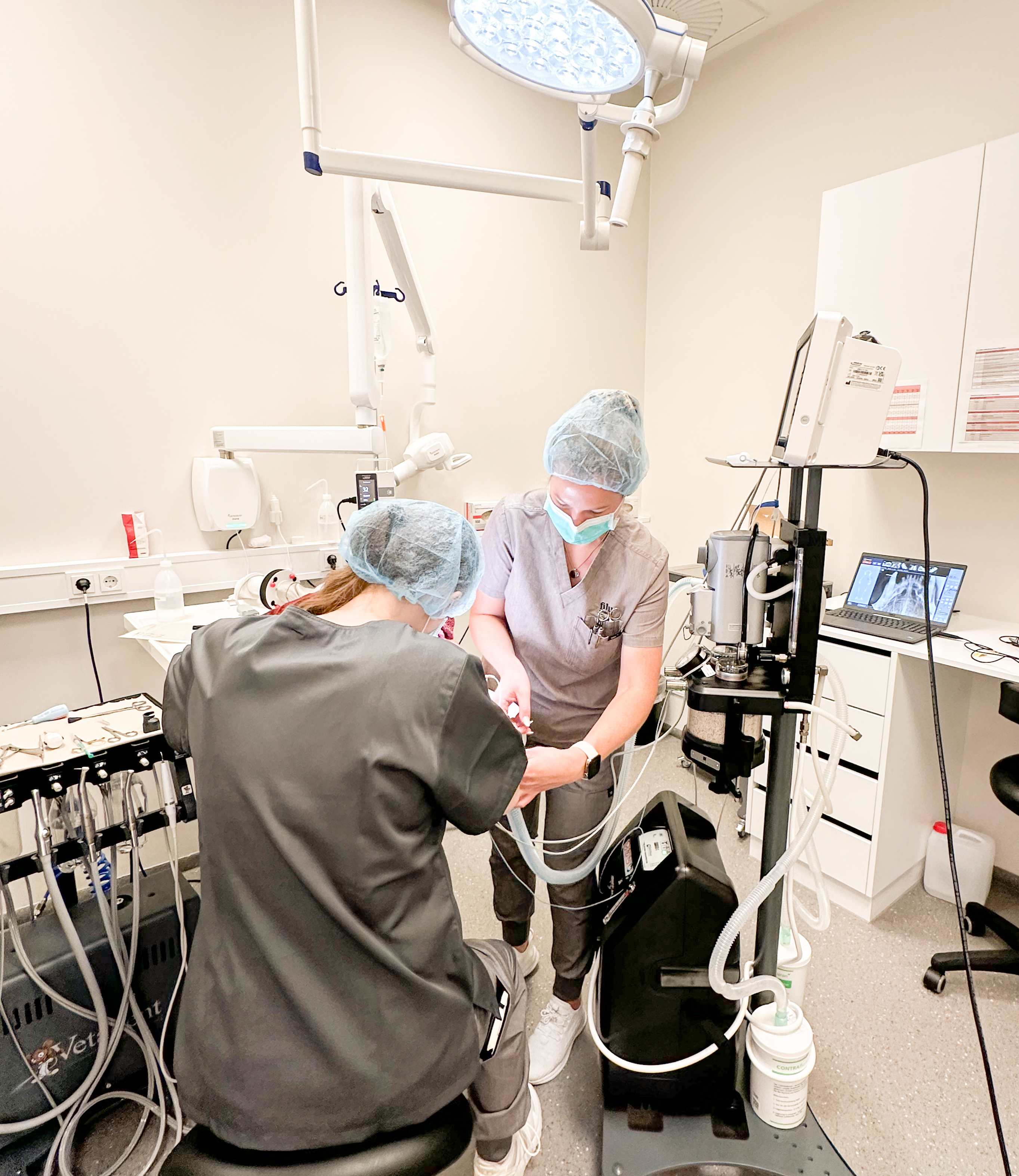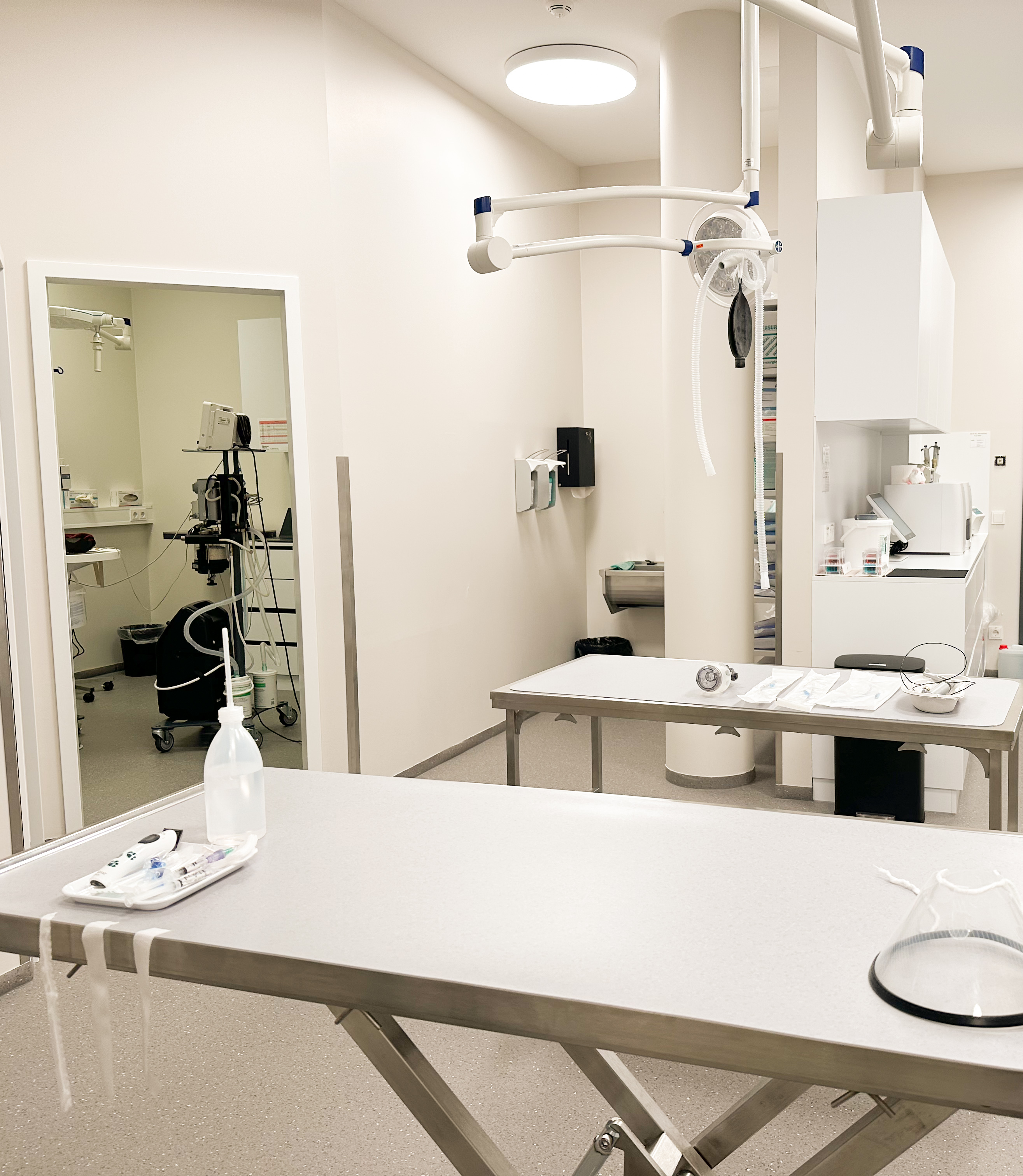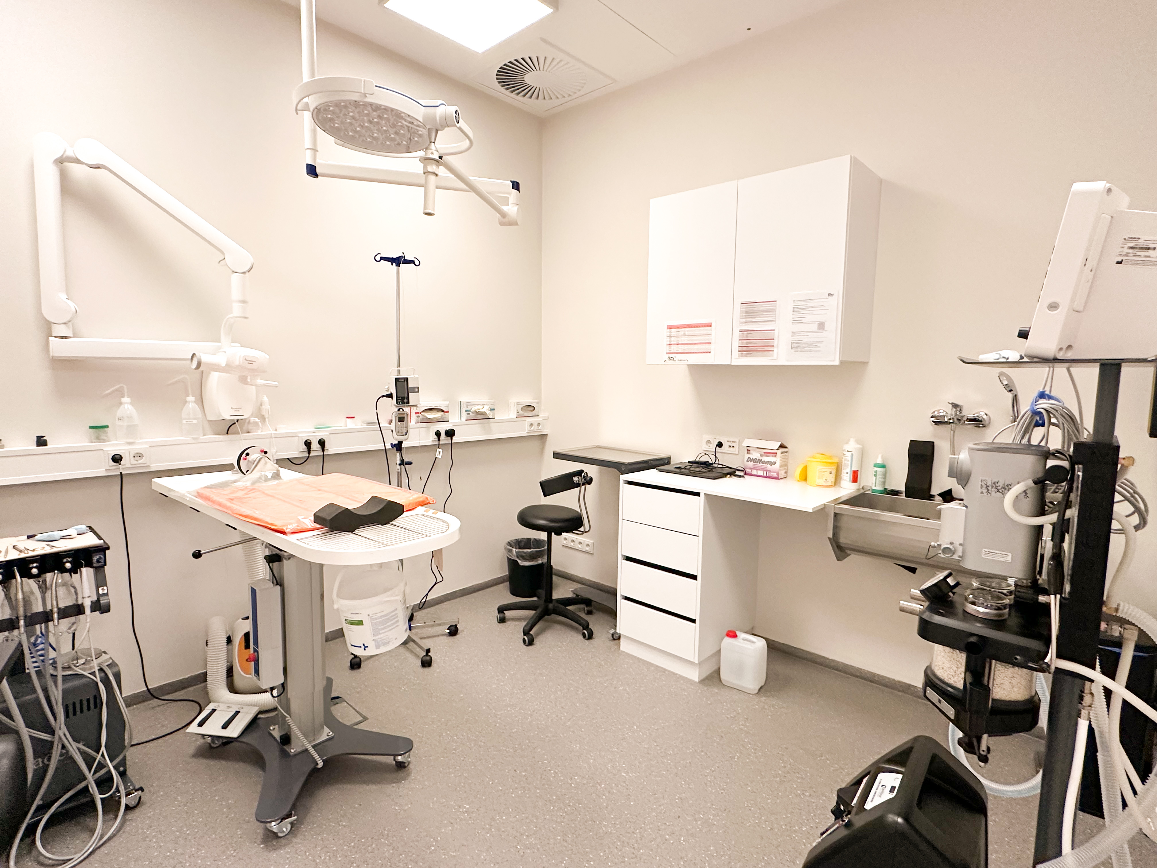 Die Praxis verfügt über fünf Behandlungszimmer, darunter ein separates Katzenzimmer sowie getrennte Wartebereiche für Hunde und Katzen. Neben Weichteil- und Dental-OP-Räumen (inkl. Dentalröntgen) sind ein Behandlungsareal für OP-Vorbereitungen, digitales Röntgen, ein kardiofähiges Ultraschallgerät und ein Inhouse-Labor für Blut-, Urin-, Kot- und Zytologieanalysen ebenso Teil der Ausstattung wie eine Apotheke und die Möglichkeit zur stationären Tagesaufnahme. Als gemütlicher Aufenthaltsraum steht Mitarbeitenden eine gut ausgestattete geräumige Küche mit Esstisch und Sofaecke zur Verfügung – inklusive Müslibar, Kaffee, Wasser und Obst. Büroflächen für Praxismanagement und ein Vet Office runden das Setup ab.